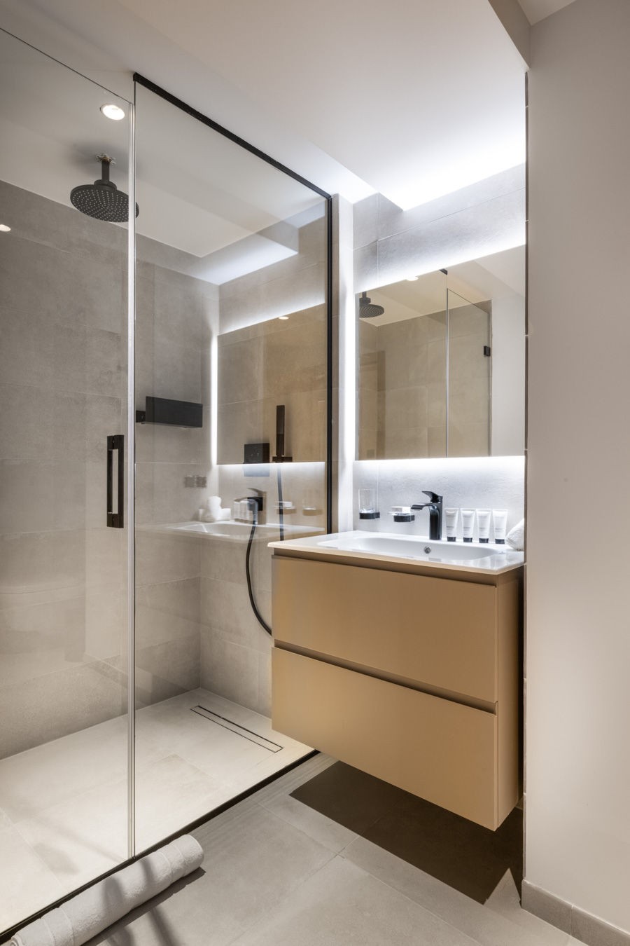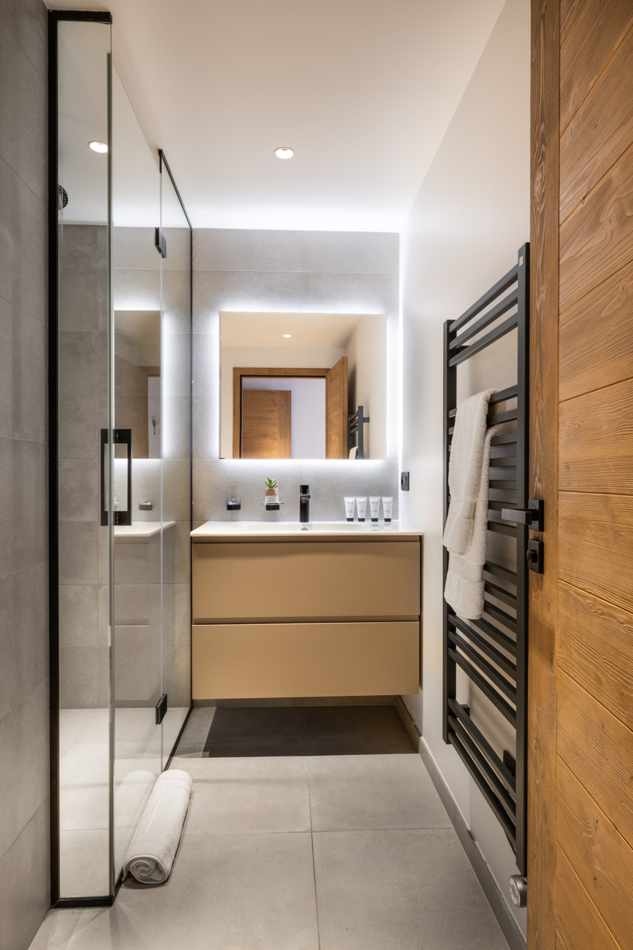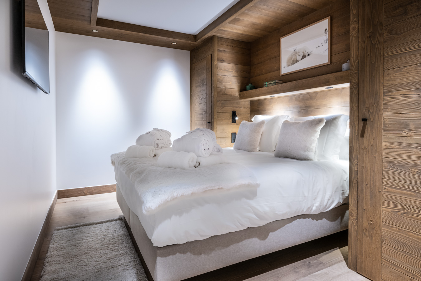Il dispose de quatre chambres avec un lit double ainsi que de quatre salles de bains attenantes. La pièce de vie bénéficie d'un coin salon avec une télévision et une cheminée gaz ainsi que d'une cuisine ouverte toute équipée. Une terrasse vient compléter l'espace avec un bain à remous. Cet appartement dispose d'appareils électroménagers tels qu'un lave vaisselle, une machine à café Nespresso, le nécessaire de cuisine, etc.